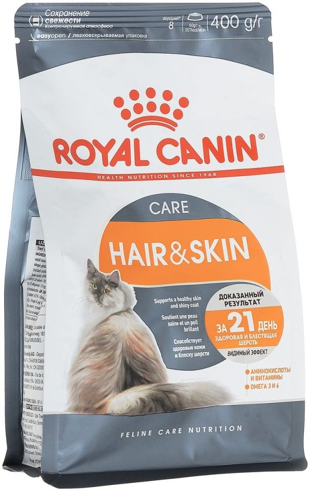 Сбалансированный состав корма Hair & Skin Care помогает поддерживать кожу и шерсть в здоровом состоянии. Данный корм содержит: - Эксклюзивный комплекс питательных веществ, способствующих укреплению кожного барьера. - Белки высокого качества, содержащие особые аминокислоты, способствуют здоровому росту шести и обновлению кожного покрова. - Жирные кислоты Омега 3 и Омега 6, благотворно влияющие на состояние кожи и шерсти.