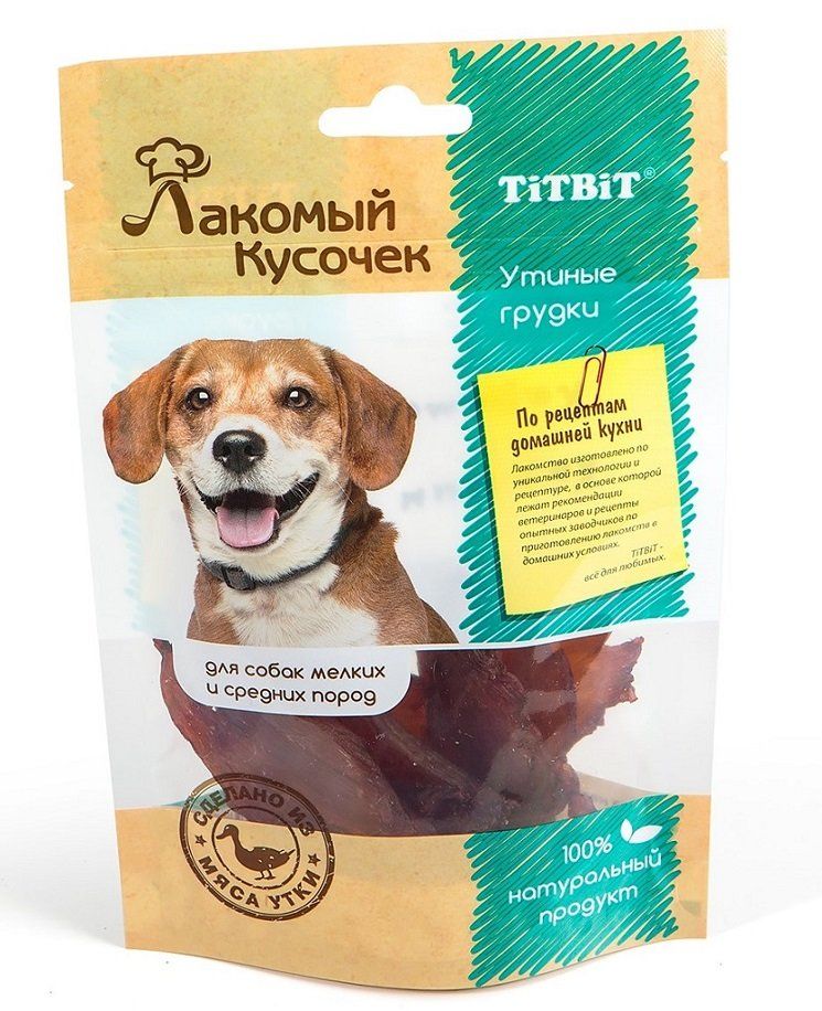 Titbit "Утиные грудки" - это вкусное и полезное лакомство для собак мелких и средних пород, изготовленное из натурального мяса телятины. Угостите лакомством своего питомца и он почувствует вашу любовь и заботу. «Лакомый кусочек» - это новая линейка мясных лакомств для собак, которые изготовлены из натуральных ингредиентов по рецептам домашней кухни.