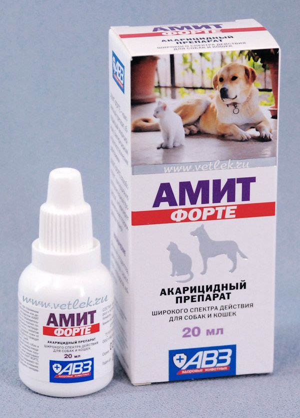 При поражении собак и кошек саркоптозом, хейлетиозом, нотоэдрозом и демодекозом препарат наносят тонким слоем на предварительно очищенные от струпьев и корочек пораженные участки кожи, равномерно распределяя от периферии к центру с захватом пограничной здоровой кожи до 1 см. Для предотвращения слизывания препарата животным надевают намордник или смыкают челюсти при помощи петли из тесмы, которые снимают через 15 − 20 минут после нанесения средства. Обработку следует проводить 2 – 5 раз с интервалом 10 дней до клинического выздоровления животного, которое подтверждают двумя отрицательными результатами акарологических исследований. Животных с обширными участками поражения кожи обрабатывают в два приема с интервалом один день, нанося препарат сначала на одну половину пораженной поверхности туловища, затем на другую. При отодектозе (ушной чесотке) перед применением препарата наружный слуховой проход очищают от корочек и струпьев при помощи ватного тампона, смоченного препаратом. Затем Амит форте закапывают в каждое ухо по 3 – 4 капли и складывают ушную раковину пополам, слегка массируя у основания, для равномерного распределения препарата. Обработку проводят 2 раза в день с интервалом 7 – 10 дней. В запущенных случаях отодектоза, осложненных отитами, назначают антибактериальные и противовоспалительные средства. При необходимости курс лечения повторяют. Препарат вводят в оба уха, даже в случаях поражения отодектозом только одного уха.