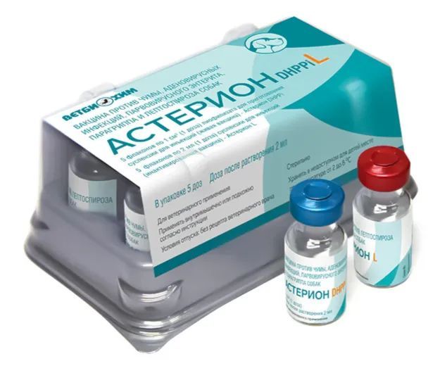 Астерион DHPPiL— вакцина для защиты собак против чумы, аденовирусных инфекций, парвовирусного энтерита, парагриппа, лептоспироза собак.