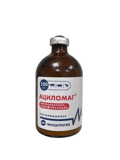 Комплексный препарат Ациломаг — суспензия для подкожных и внутримышечных инъекций, в качестве действующих веществ содержит 10% амоксициллина, 5% энрофлоксацина. Выпускают в форме стерильной суспензии белого цвета во флаконах из темного стекла по 100 мл.