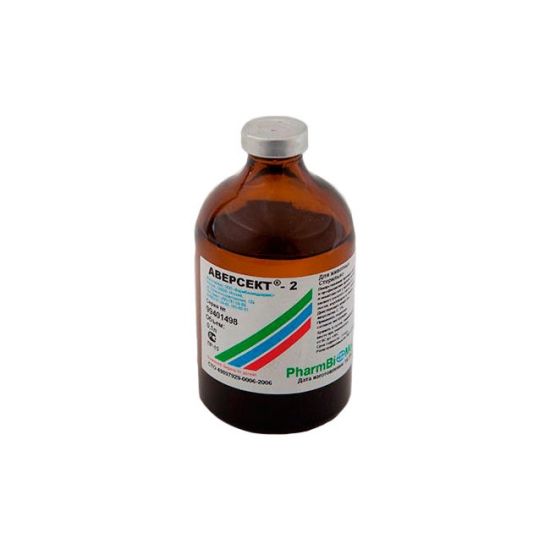 Фармакологическое действие. Аверсект-2 обладает выраженным противопаразитарным действием на нематод и личинки подкожных, носоглоточных, желудочных оводов, а также на вшей, кровососок и возбудителей саркоптоидозов животных. Препарат усиливает выработку нейромедиатора торможения гамма-аминомасляной кислоты, что приводит к параличу и гибели паразита. Препарат малотоксичен для теплокровных животных. В рекомендуемых дозах не оказывает сенсибилизирующего, эмбриотоксического, тератогенного и мутагенного действия.