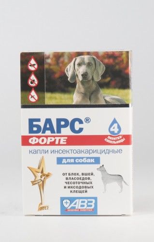 Инсекто-акарицидные капли Барс форте оказывают губительное действие на личинок и половозрелых клещей семейства Ixodidae, клещей Sarcoptes canis, Sarcoptes cati, Cheyletiella jascuri и Notoedres cati и насекомых Linognathus setosus, Trichodectes canis, Ctenocephalides canis и Ctenocephalides felis. Высокая инсекто-акарицидная активность капель обусловлена наличием в их составе фипронила и регулятора роста насекомых. Механизм действия фипронила заключается в блокировании ГАМК-зависимых рецепторов паразита и нарушении нервно-мышечной передачи, что приводит к его параличу и гибели. Регулятор роста насекомых ингибирует процессы хитинообразования, нарушает процессы линьки, окукливания и окрыления паразита. Препарат по степени воздействия на организм теплокровных животных относится к умеренно опасным веществам и в рекомендуемых дозах не оказывает тератогенного, эмбриотоксического и местнораздражающего действия.