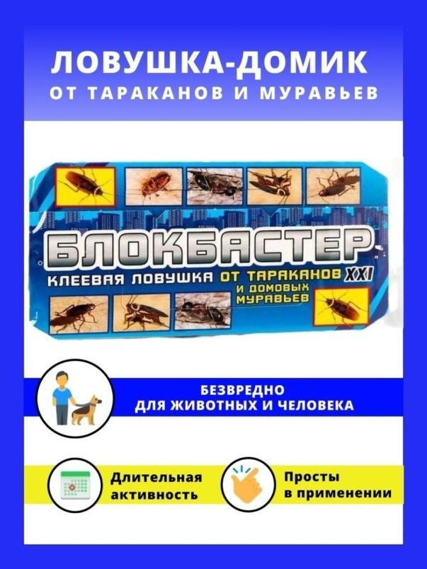 Высокоэффективное, нетоксичное средство для уничтожения тараканов и домовых муравьев.Абсолютно безвредно для человека и домашних животных, не оказывает раздражающего воздействия на кожу. Клеевые ловушки просты в применении и могут быть установлены в любом месте, в т. ч. в местах хранения пищевых продуктов. Вскрытые ловушки сохраняют активность в течение 3-x месяцев.Упаковка/штрих-код «Блокбастер XXI клеевая ловушка-домик» — от тараканов и домовых муравьев: 4620015694702 — ловушка-домик, 1 штСостав: каучук — 52%, производные полиизобутилена — 25%, пищевой аттрактант — 3%, масло минеральное — 20%. Не содержит токсического вещества.Применение: аккуратно открыть ловушку и отделить бумагу, закрывающую клей. С помощью клапана для фиксации сомкнуть замок. Установить ловушку вблизи от стен. Для достижения лучшего результата рекомендуется использовать несколько ловушек одновременно.Меры предосторожности: не допускать попадания средства в глаза и на кожу. Хранить в сухом прохладном месте, недоступном для детей и домашних животных. Предохранять от воды и прямых солнечных лучей. При попадании средства на кожу смыть его тампоном, смоченным в растительном масле.Хранить в сухом, закрытом складском помещении в закрытой таре при температуре от –40 °С до +40 °С.Срок годности: 3 года.