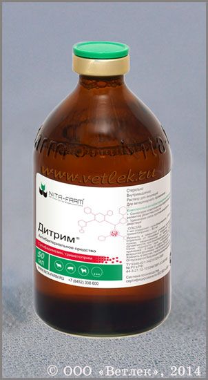 Сульфадимезин и триметоприм, входящие в состав препарата, проявляют синергизм действия, тем самым усиливают действие друг друга путем последовательного воздействия на метаболизм n-аминобензойной и фолиевой кислот в микробной клетке. Взаимодействие этих компонентов способствует расширению антибактериального спектра действия препарата. Дитрим быстро всасывается из места введения, распределяется в органах и тканях животного, достигая максимальной концентрации через 2 – 3 часа после инъекции. Антибактериальное действие поддерживается в течение суток. Спектр действия препарата охватывает грамположительные и грамотрицательные микроорганизмы, в т. ч. E. coli, Clostridium spp., Salmonella spp., Proteus spp., Bacillus anthracis, Pasteurella spp., Haemophilus spp., Vibrio spp., Staphylococcus spp., Streptococcus spp., Shigella spp., Corynebacterium spp., Klebsiella spp., Fusobacterium spp., Bordetella spp., Brucella spp.). Дитрим малотоксичен для теплокровных животных, в рекомендуемых дозах не оказывает сенсибилизирующего, эмбриотоксического, тератогенного и мутагенного действия. Выводится из организма в основном с мочой, у лактирующих животных частично с молоком.