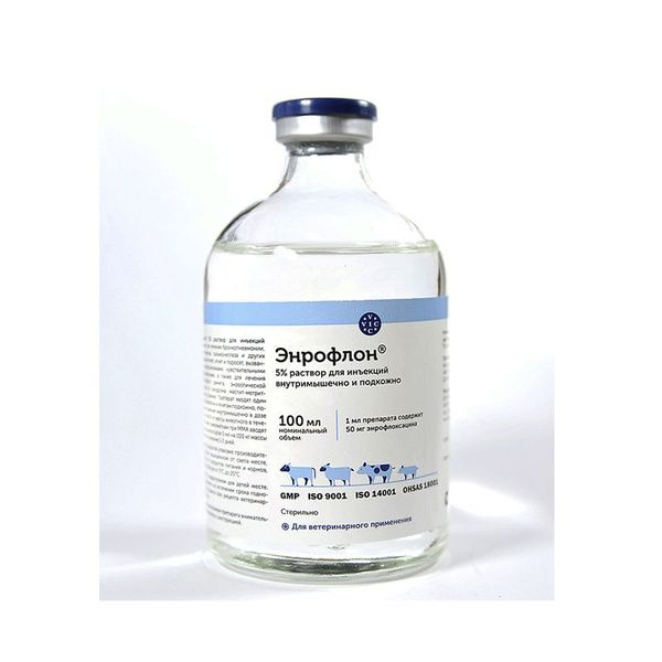 Энрофлоксацин относится к группе фторхинолонов и обладает широким спектром антибактериального действия, подавляет рост и развитие грамположительных и грамотрицательных микроорганизмов, в том числе Е. coli, Haemophilus, Klebsiella, Pasteurella, Pseudomonas, Bordetella, Campylobacter, Erysipelothrix, Corynebacterium, Staphylococcus, Streptococcus, Actinobacillus, Clostridium, Bacteroides, Fusobacterium, а также Mycoplasma spp. Препарат хорошо и быстро всасывается из места инъекции и проникает во все органы и ткани организма. Максимальная концентрация препарата в крови достигается через 0,5 — 1 час после введения энрофлона и сохраняется на протяжении 4 — 6 часов, а терапевтическая концентрация — на протяжении 24 часов. Энрофлоксацин практически не подвергается биотрансформации в организме и выделяется преимущественно в неизмененном виде с мочой и с желчью.