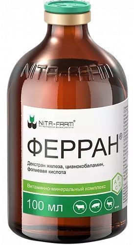 Ферран® – железо-витаминный комплекс, при парентеральном введении восполняет в организме недостаток железа, фолиевой кислоты (витамина В₉) и цианокобаламина (витамина В₁₂), вызванный экологическими причинами, потерей крови, погрешностями в кормлении или заболеваниями животных. Активизирует процессы кроветворения и окислительно-восстановительные реакции, способствует повышению общей резистентности организма.