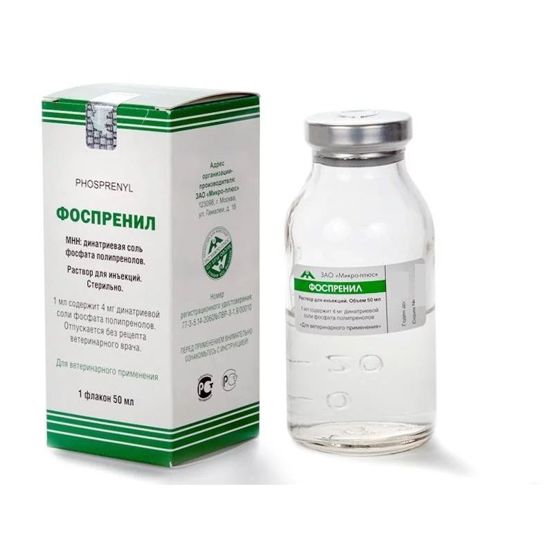 Препарат вводят главным образом внутримышечно. При лечении вирусных инфекций собак разовая доза фоспренила составляет 0,1 мл на 1 кг массы тела. При лечении вирусных инфекций кошек разовая лечебная доза фоспренила составляет 0,2 мл на 1 кг массы тела. При тяжелых и среднетяжелых клинических формах вирусных инфекций разовая лечебная доза фоспренила должна быть удвоена: собакам — 0,2 мл на 1 кг массы тела; кошкам — 0,4 мл на 1 кг массы тела. Возможно применение препарата внутрь собакам и кошкам, при этом следует использовать разовую дозу, увеличенную в 2 раза по отношению к внутримышечной. При лечении вирусных заболеваний телят разовая внутримышечная доза составляет 0,1 мл на 1 кг массы тела. При лечении вирусных энтеритов поросятам-сосунам массой 3 – 5 кг вводят внутримышечно в течение 8 суток по 0,5 мл фоспренила. Схема лечения зависит от вида заболеваний. Универсальный курс при тяжелых формах чумы плотоядных у собак, панлейкопении и инфекционном перитоните у кошек состоит из 40 доз: с 1-го по 2-й день – 4 дозы в сутки (через каждые 6 часов), с 3-го по 10-й день – 3 дозы в сутки (через каждые 8 часов), с 11-го по 13-й день – 2 дозы в сутки (через каждые 12 часов), 14-й и 15-й дни – 1 доза в сутки. При среднетяжелых формах чумы плотоядных у собак, панлейкопении и инфекционном перитоните у кошек, а также при парвовирусом энтерите и гепатите у собак применяется следующая схема лечения: в 1-й день – 4 дозы в сутки (через каждые 6 часов), со 2-го по 8-й день – 3 дозы в сутки (через каждые 8 часов), с 9-го по 11-й день – 2 дозы в сутки (через каждые 12 часов), с 12-го по 15 день – 1 доза в сутки. При легком течении тех же вирусных инфекций, а также при аденовирозах у собак и вирусном ринотрахеите у кошек принципиальная схема лечения остается такой же, но общая продолжительность курса сокращается до 3 – 7 суток: в 1-й день (либо в первые 2 – 3 дня) – 3 дозы в сутки (через каждые 8 часов), во 2-й день (либо на 3 – 5-й дни) – 2 дозы в сутки (через каждые 12 часов), на 3-й день (либо на 5 – 7-й дни) – 1 доза в сутки. При легком течение чумы плотоядных (начальная стадия) общая продолжительность лечения должна быть не менее 2-недель. При лечении вирусных заболеваний телят применяется следующая схема: в 1-й день – 4 инъекции в сутки (через каждые 6 часов), со 2-го по 4-й день – 3 инъекции в сутки (через каждые 8 часов), на 5-й день – 2 инъекции в сутки (через каждые 12 часов). При необходимости курс лечения можно продлить до 7 суток, вводя по разовой дозе препарата 2 раза в день. При лечении вирусных энтеритов поросят применяется следующая схема лечения: в 1-й день – 4 инъекции в сутки (через каждые 6 часов), со 2-го по 4-й день – 3 инъекции в сутки (через каждые 8 часов), с 5-го по 7 день – 2 инъекции в сутки (через каждые 12 часов), на 8-й день – 1 инъекция в сутки. Лечебную схему можно корректировать в зависимости от тяжести заболевания и особенности индивидуальной чувствительности организма. При необходимости возможно назначение повторных курсов лечения. При тяжелых и среднетяжелых клинических формах вирусных инфекций необходимо применять фоспренил в сочетании с антибиотиками, противогистаминными препаратами и симптоматической терапией, направленной на коррекцию водно-солевого и кислотно-щелочного равновесия, детоксикацию организма, нормализацию температуры тела и поддержание жизненно важных органов. Дополнительного применения имм