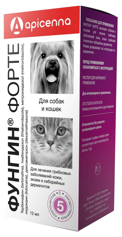 Фунгин Форте относится к комбинированным противомикробным лекарственным препаратам. Тербинафин – противогрибковое средство группы аллиламинов, активен в отношении возбудителей дерматомикозов жи- вотных. Механизм действия заключается в подавлении скваленэпоксидазы в клеточной мембране гриба. Это приводит к дефициту эргостерола и внутриклеточному накоплению сквалена, что вызывает гибель клетки возбудителя. В зависимости от концентрации тербинафин проявляет фунгицидный или фунгистатический эффект. Благодаря высокой липофильности молекулы тербинафина накапливаются в роговом слое дермы, волосяных фолликулах, сальных железах; при местном при- менении в системный кровоток препарат проникает в незначительной степени. Тиабендазол – фунгицид из класса азолов. Активен в отношении возбудителей трихофитии и микроспории животных родов Trichophyton, Microsporum, Epidermophyton, Achorion. Как и другие азолы, блокирует активность ферментов, участвующих в 14-деметилировании ланостерола, что ведёт к нарушению синтеза эргостерола. Изменение структуры цитоплазматической мембраны грибковых клеток приводит к нарушению ее проницаемости, выходу из клетки биологически активных веществ и разрушению клеточной стенки. Кроме того, тиабендазол нарушает процесс деления ядра, тормозит репродуктивную способ- ность грибов. Метронидазол – препарат из группы нитроимидазолов. Механизм действия заключается в биохимическом восстановлении 5-нитрогруппы метронидазола внутриклеточными транспортными протеинами анаэробных микроорганизмов и простейших. Восстановленная 5-нитрогруппа метронидазола взаимодействует с ДНК бактериальной клетки, ингибируя в ней синтез нукле- иновых кислот, что ведет к гибели микроорганизма. Дексаметазон – синтетический глюкокортикостероид, метилированное производное фторпреднизолона. Оказывает противо- воспалительное, противоаллергическое, десенсибилизирующее, иммунодепрессивное, противошоковое и антитоксическое действие, повышает чувствительность бета-адренорецепторов к эндогенным катехоламинам. Механизм действия дексаме- тазона заключается в подавлении активности различных разрушающих ткани ферментов – протеаз и нуклеаз, матриксных металлопротеиназ, гиалуронидазы, фосфолипазы, торможении синтеза простагландинов, кининов, лейкотриенов и других медиаторов воспаления из арахидоновой кислоты. Лидокаин – обладает местноанестезирующим действием, блокирует потенциалзависимые натриевые каналы, что препятствует генерации импульсов в окончаниях чувствительных нервов и проведению импульсов по нервным волокнам. Фунгин Форте по степени воздействия на организм относится к малоопасным веществам (4 класс опасности по ГОСТ 12.1.007-76), в рекомендуемых дозах не оказывает местно-раздражающего, резорбтивно-токсического и сенсибилизирующе- го действия. При попадании в глаза вызывает слабое раздражение.