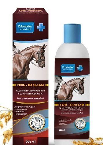 высокоэффективное средство применяемое лошадям при различных нарушениях опорно-двигательного аппарата: травмы, растяжения, артриты, остеоартриты, остеохондроз, лопаточно-плечевого полиартрит, миозиты, бурситы, тендиниты и т.д. Активные компоненты (хондропротекторы, экстракт прополиса, камфора и эфирноем масло мяты) быстро и глубоко проникают в ткани, способствуют улучшению кровообращения, дополнительному питанию и восстановлению хрящевой ткани животного. Гель-бальзам способствует исчезновению воспаления, отека и болевого синдрома (тормозит проведение нервных импульсов), оказывает антисептическое и фибринолитическое действие, улучшает метаболические процессы в суставах, тем самым тормозит прогрессирование дегенеративных изменений. Эффективные хондропротекторы (глюкозамин сульфат и хондроитин сульфат) улучшают фосфорно-кальциевый обмен и способствуют восстановлению хрящевой ткани суставных поверхностей и суставной сумки, а также стимулируют выработку внутрисуставной жидкости, делая суставы животного подвижными. Натуральный экстракт прополиса усиливает действие хондропротекторов и позволяет долго сохранять их терапевтическое действие, а также оказывает противовоспалительное, анестезирующее и регенирирующее действие на ткани. Диметилсульфоксид позволяет активным компонентам геля максимально быстро и глубоко проникнуть через кожные барьеры и получить стойкий лечебный результат.