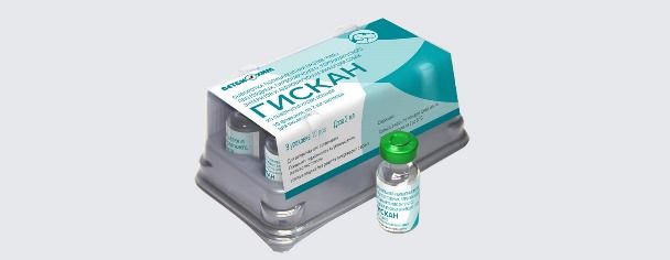 Лекарственная форма - раствор для инъекций. ГИСКАН - сыворотка крови лошадей, содержащая специфические антитела к возбудителям чумы плотоядных, парвовирусного и коронавирусного энтеритов и аденовирусных инфекций собак.