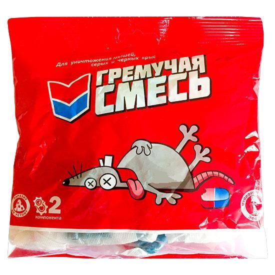 Родентицидное средство Гремучая смесь - это готовая к применению пищевая тестообразная приманка красного и синего цвета в равных долях. Средство обладает высокой родентицидной активностью для крыс и мышей: поедаемость приманки составляет: 49% от суточного рациона крыс, 43% -домовых мышей и 35% - полевок. Гибель крыс наступала на 4-5 день ( 4,3 дн. в среднем), на 5-4 день ( 4, 7 дн. в среднем) - мышей и на 5-4 день (4,5 дн. в среднем) - полевок.