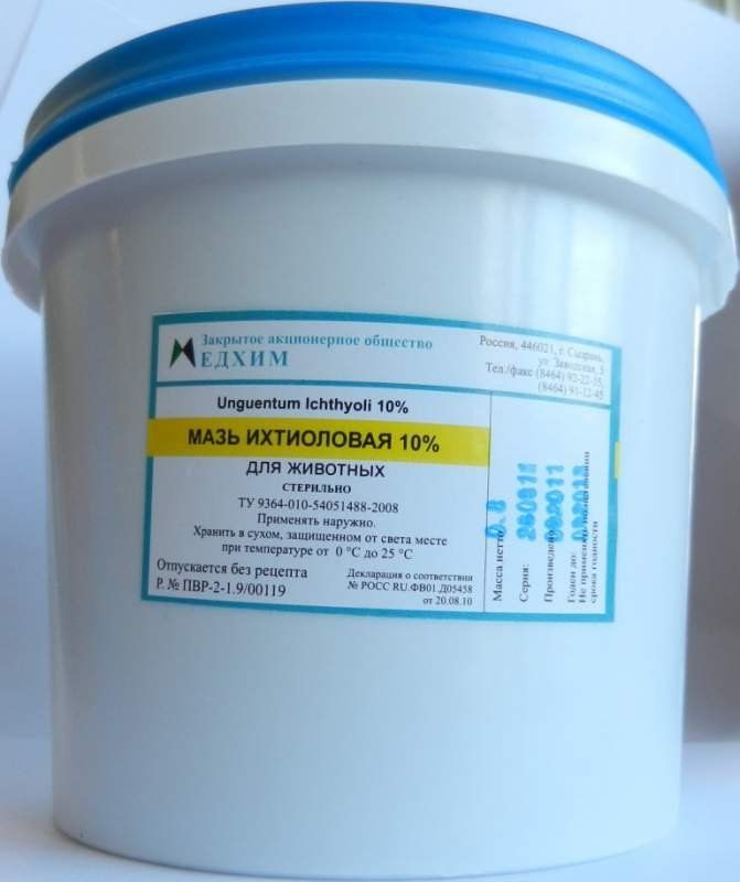 Мазь ихтиоловую 10% применяют животным (кроме кошек) при заболеваниях кожи (экземы, дерматиты).