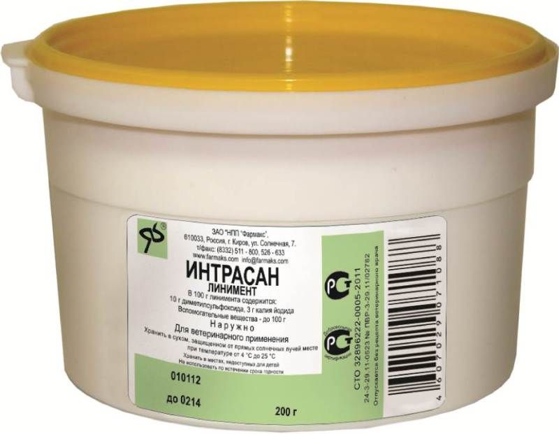 «Интрасан», слегка втирая, наносят ровным тонким слоем в дозе 20-30 г на кожу каждой пораженной доли вымени после доения. Кратность нанесения - 12 часов.