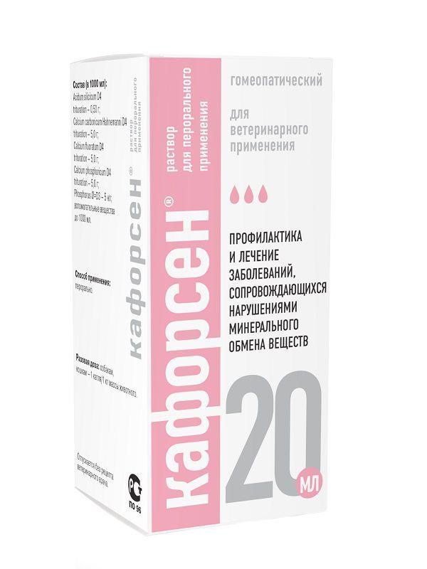1. Кафорсен — гомеопатическое лекарственное средство, предназначенное для регуляции минерального обмена веществ у животных.