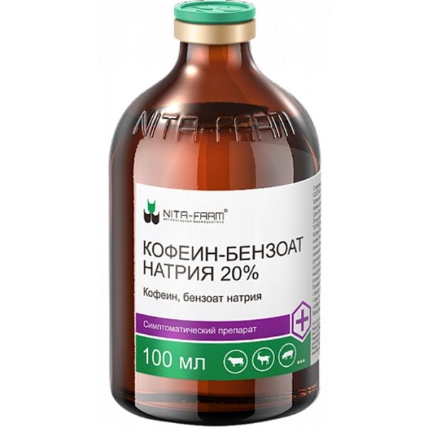 Препарат обладает возбуждающим действием на центральную нервную систему, главным образом кору головного мозга, дыхательный и сосудодвигательный центры; значительно возбуждает спинной мозг; улучшает сердечную деятельность; сложно влияет на сосудистую систему; увеличивает работоспособность поперечнополосатой мускулатуры и повышает диурез. Стимулирующее действие кофеина приводит к повышению двигательной активности, уменьшению усталости и сонливости. Сила и продолжительность действия препарата зависят от состояния организма, функциональной активности различных его систем, типа высшей нервной деятельности животных, а также от дозы, которая в больших количествах может привести к истощению нервных клеток. Кофеин-бензоат натрия легко всасывается из места инъекции и быстро начинает выделяться главным образом почками и частично железами пищеварительного тракта.