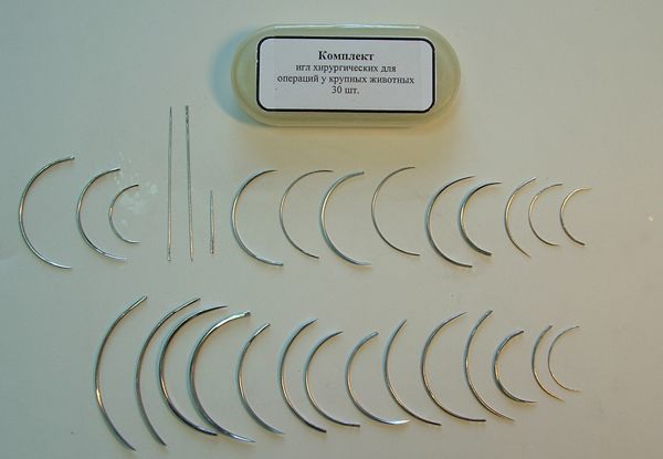 Хирургические иглы выпускаются: прямые, с изогнутым концом, изогнутые на 2/8, 3/8, 4/8 и 5/8 окружности; с круглым и трехгранным острием; с пружинящей и непружинящей формой ушка.