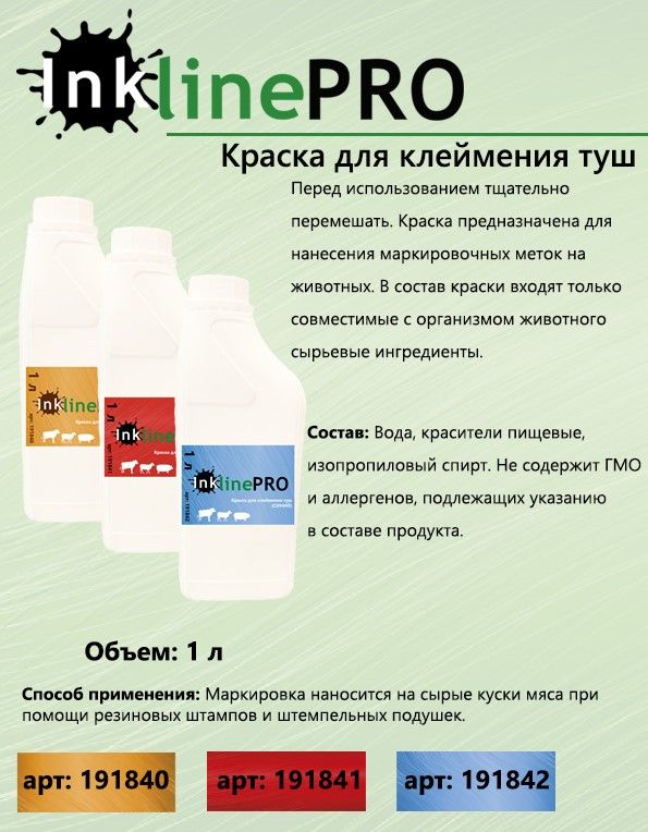 Краска для клеймения тушь, мясо и мясопродукты (субпродукты) применяется для сельскохозяйственных и диких животных, в том числе птицы, которые, подлежат обязательному клеймению ветеринарными клеймами и штампами в соответствии с требованиями.