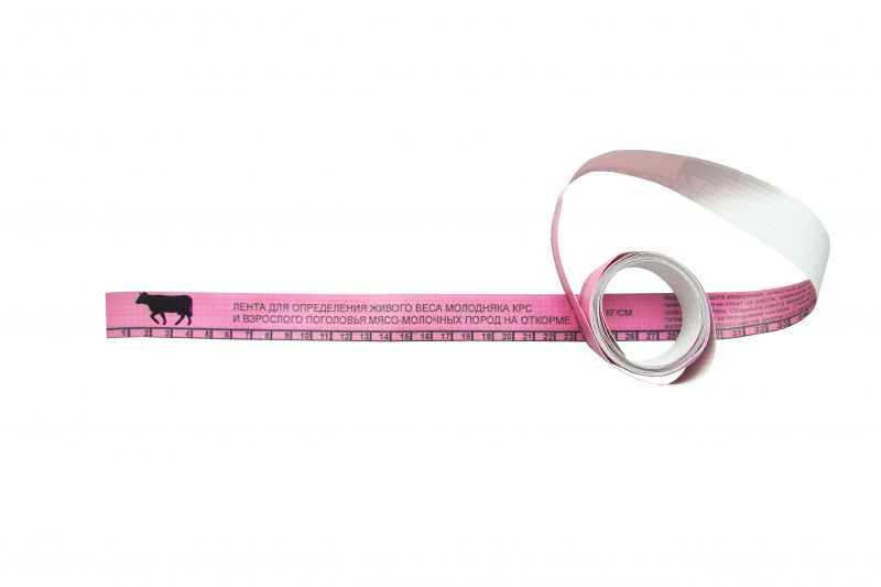 Мерная лента для определения живого веса мясного скота на откорме по упитанности. Измерение живого веса с помощью ленты исключает дополнительные стрессы у животных, экономит силы и время обслуживающего персонала. При удовлетворительном развитии животного отклонение от истинного значения веса не превышает 4 кг. Ленты выпускаются на синтетической основе.