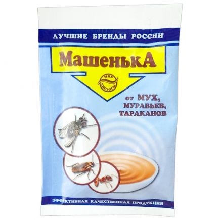 Инсектицидное средство Машенька - готовая приманка с пищевыми привлекантами. Действие приманки начинается через 10 минут после раскладки и сохраняется в течение 2 месяцев. Специальный горький компонент (битрекс) исключает поедание приманки животными и птицами