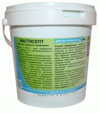Мастисепт представляет собой густую однородную мазеобразную массу лазурного цвета со стойким специфическим запахом камфоры, в 1 г которой содержится 0,05 г камфоры, 0,02 г метилсалицитата и основы до 1 г