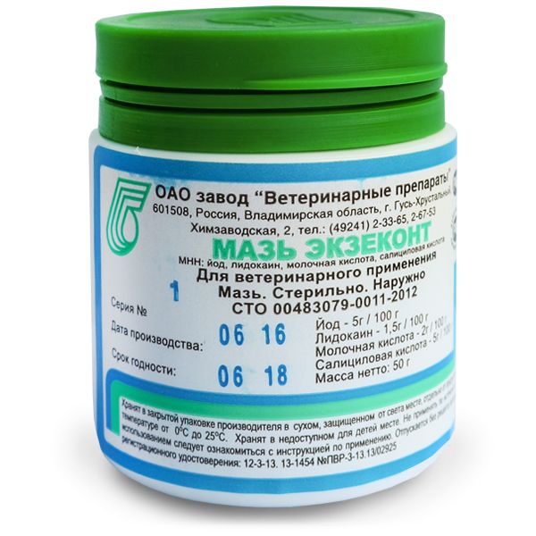 1.3. Мaзь Экзеконт хранят в закрытой упаковке производителя, в сухом, защищенном от света месте, отдельно от продуктов питания и кормов, при температуре от 0 oС до 25 oС.
