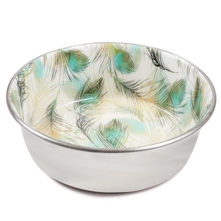 Миска интерьерная из нержавеющей стали на резинке "Перышки" для кошек и собак небольших пород. Миска уникальна тем, что роспись на внутренней поверхности изделия выполнена вручную. Изделие идеально подходит как для воды, так и для корма разной консистенции. Прорезиненное основание обеспечивает максимальную устойчивость, препятствуя скольжению изделия во время использования, а необычная роспись сделает такую миску украшением любого интерьера. Миска комфортна для питомца и легко моется под струей проточной воды с использованием моющих бытовых средств. Не рекомендуется мыть в посудомоечной машине. Цвет изделия: бело-охристо-зеленый. Объем: 0,32л.