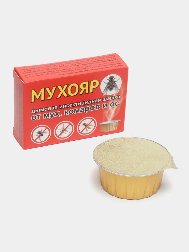Этих недостатков лишено новое средство «Мухояр» - инсектицидная шашка. Препарат представляет собой порошок в жестяной баночке.