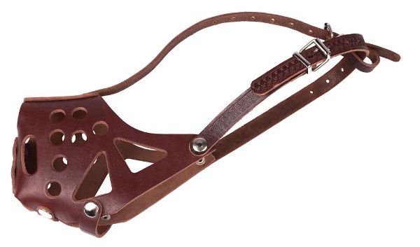 Эргономичный сплошной намордник из натуральной кожи, учитывающий породные особенности собак данного типа. Имеет множество вентиляционных отверстий, оснащен дополнительным налобным ремешком.