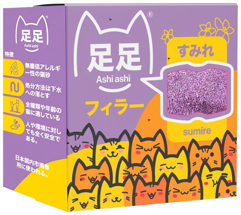 Японский натуральный комкующийся биоразлагаемый наполнитель Ashi Ashi - технологически новый натуральный продукт, из высококачественных растительных волокон, спрессованных и обработанных по специальной технологии. Благодаря уникальной формуле и специальному размеру гранул, наполнитель мгновенно впитывает влагу и запах, образуя плотный очень компактный комок, который легко утилизируется в туалет. Максимально экономичен в использовании. Препятствует росту простых бактерий и грибков, без пыли, гипоалергенный, подходит для кошек всех пород и возрастов, полностью безопасен для человека и окружающей среды. AshiAshi sumire - гранулы светло-фиолетового цвета с приятным ароматом Японской фиалки. Разрешена утилизация наполнителя в УНИТАЗ или путем КОМПОСТИРОВАНИЯ! Разработан с учетом всех предпочтений японских потребителей.