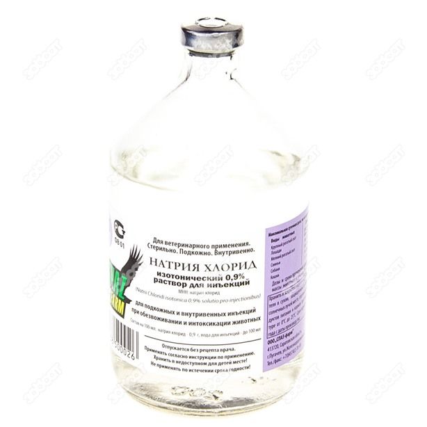Натрия хлорид содержится в крови, тканевых жидкостях, и его концентрация обеспечивает постоянство осмотического давления крови. При дефиците натрия хлорида наблюдается сгущение крови в связи с переходом воды из кровяного русла в ткани. При значительном дефиците могут развиться спазмы гладкой мускулатуры, судорожные сокращения скелетных мышц, нарушения функции нервной системы и кровообращения. Раствор натрия хлорида 0,9% изотоничен плазме крови животных, поэтому его часто именуют «физиологическим», однако это название является условным, так как раствор не содержит других веществ (солей кальция, калия и др.), которые необходимы для сохранения физиологических свойств организма. Препарат регулирует кислотно-щелочное равновесие организма, проявляет дезинтоксикационные свойства, не оказывает раздражающего действия на ткани. При катаральных процессах препарат разжижает слизь, облегчает ее отделение и тем самым способствует ликвидации воспалительного процесса. Раствор быстро выводится из сосудистой системы и только временно увеличивает объем жидкости, циркулирующей в сосудах, поэтому при больших кровопотерях и шоке он недостаточно эффективен. В этих случаях одновременно используют и другие плазмозамещающие жидкости (гемодез, энтеродез, полиглюкин и др.).