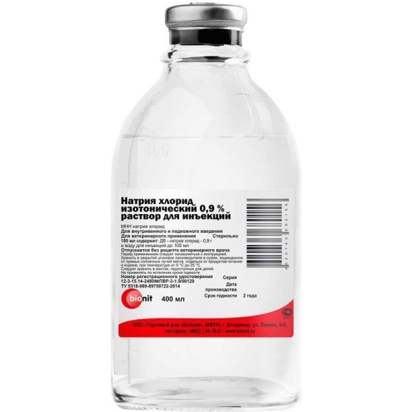 Натрия хлорид изотонический 0,9% раствор для инъекций применяют животным при больших потерях организмом жидкости (кровотечения, токсическая диспепсия), явлениях шока, интоксикациях, метритах, вагинитах, а также для растворения различных лекарственных препаратов.