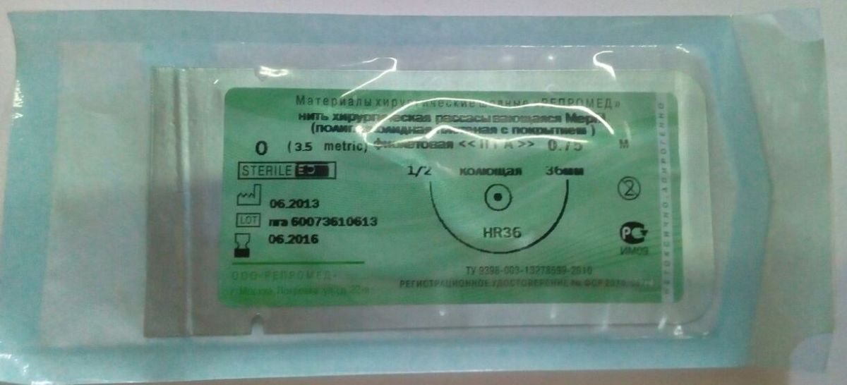 Нить Mepfil изготовлена из полигликолевой кислоты (PGA). Нить покрыта резолактоном – смесью полиэфира, синтезированного полимеризацией e-капролактона и стеарата кальция. Нить плетеная фиолетовая или неокрашенная.