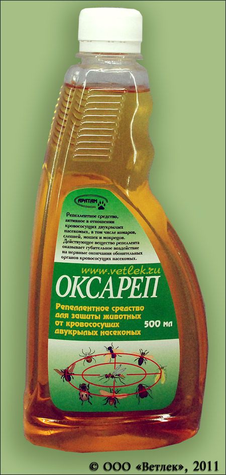 Обработку животных проводят в период активного лёта насекомых на открытом воздухе c расстояния 25 – 30 см. Прикрыв глаза животного, обрабатывают все части тела, особенно область головы, спины и конечностей. Обработку Оксарепом из аэрозольного баллона проводят в зависимости от массы животного в течение 15 – 20 секунд (при использовании беспропеллентного баллона нажимают на ручку распылителя 15 – 20 раз). Расход препарата на одну голову составляют от 40 до 100 мл. Повторные обработки животных проводят по энтомологическим показаниям. Против комаров, слепней и мокрецов — один раз в сутки, против мошек — по мере необходимости.
