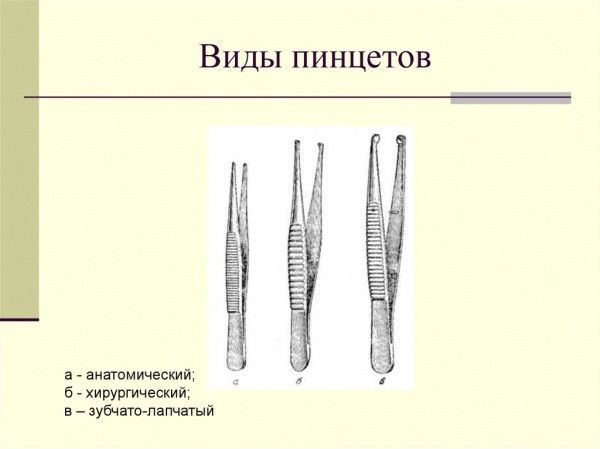 Хирургические (главный вспомогательный инструмент, используемый на операциях и перевязках): с острыми зубцами на концах, которые обеспечивают более жесткую и травматичную фиксацию (для использованиях на плотных тканях типа кожи, сухожилия и пр.), т.е. используются, когда анатомический пинцет не способен удерживать более жесткие ткани.