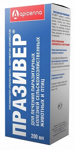 Крупному рогатому скоту и лошадям суспензию применяют индивидуально, овцам и козам — индивидуально или групповым способом в смеси с концентрированным кормом при нематодозах желудочно-кишечного тракта (гемонхоз, буностомоз, эзофагостомоз, нематодироз, хабертиоз, коопериоз, остертагиоз, стронгилоидоз, трихостронгилез, трихоцефалез, неоаскаридоз), нематодозах легких (диктиокаулез, мюллериоз, цистокаулез, протостронгилез), цестодозах, при гиподерматозе, гастрофиллезе и саркоптоидозах в дозе 0,4 мл на 10 кг массы животного. Мелкому рогатому скоту при эстрозе назначают из расчета 0,6 мл суспензии на 10 кг массы животного. При групповом способе количество препарата, рассчитанное на группу овец или коз (но не более 100 голов), смешивают с концентрированным кормом из расчета в среднем по 150 – 200 г корма на одно животное. Профилактическую дегельминтизацию животных проводят перед постановкой на стойловое содержание и весной, перед выгоном на пастбище, обработку против личинок оводов — сразу после окончания их лета, однократно, при саркоптоидозах (саркоптоз, псороптоз, хориоптоз) — по показаниям двукратно с интервалом 7 –12 дней. Свиньям Празивер применяют индивидуально или групповыми способом с концентрированными кормами в дозе 0,6 мл на 10 кг массы тела животного. При нематодозах (аскаридоз, эзофагостомоз, метастронгилез, трихоцефалез, стронгилоидоз) животных дегельминтизируют однократно, при саркоптозе обрабатывают двукратно с интервалом 7 – 10 суток. При групповом способе количество препарата, рассчитанное на группу свиней (но не более 50 голов) смешивают с половиной нормы корма и раскладывают по кормушкам, обеспечивая животным свободный доступ к ним. Цыплятам-бройлерам, ремонтному молодняку кур Празивер применяют не позднее, чем за 2 недели до начала яйцекладки; гусям и уткам при нематодозах (гангулетеракидоз, аскаридиоз, гетеракидоз) и цестодозах (дрепанидотениоз, гименолепидоз, райетиноз). Птице задают препарат индивидуально или групповым способом в смеси с кормом в утреннее кормление в дозе 0,2 мл на 1 кг массы тела. Перед использованием флакон с препаратом следует тщательно взболтать в течение 1 – 2 минут. Перед массовыми обработками каждую серию препарата следует обязательно испытать на небольшой группе животных (5 – 7 голов) разного возраста и веса. При отсутствии в течение 3 дней у них осложнений приступают к обработке всего поголовья.