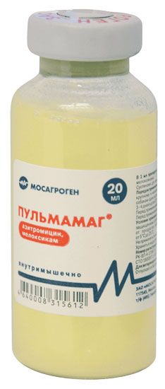 Пульмамаг® - комплексный лекарственный препарат, содержащий бактериостатический антибиотик широкого спектра действия из группы макролидов-азалидов и мелоксикам, относящийся к нестероидным противовоспалительным средствам группы оксикамов.