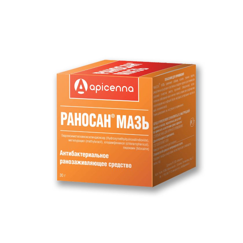 Раносан мазь в 1г в качестве действующих веществ содержит: гидроксиметилхиноксилиндиоксид – 10 мг, метилурацил – 30 мг, хлор-амфеникол – 10 мг и лидокаина гидрохлорид – 50 мг, а также вспомогательные вещества: окись цинка, ланолин, парафин, воск эмульсионный, метилпарабен, пропилпарабен, воду очищенную и вазелин.