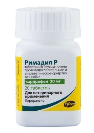 Римадил Р таблетки — светло-коричневые таблетки с вытисненной буквой «R» с одной стороны таблетки и разделительной бороздкой на другой стороне, содержащие в качестве действующего вещества 20 мг карпрофена и формообразующие компоненты. Расфасовывают в пластиковые банки по 20 таблеток.