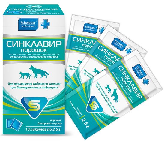 Лекарственный препарат Синклавир порошок для собак и кошек содержит в 1 г в качестве действующих веществ: амоксициллина тригидрат - 115 мг (в пересчете на амоксициллин - 100 мг), калия клавуланат - 29,5 мг (в пересчете на клавулановую кислоту - 25 мг).