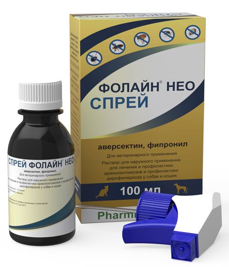 Спрей Фолайн НЕО обладает выраженным инсектицидным и акарицидным действием. Активен против личиночных и половозрелых фаз развития вшей (Linognathus setosus), блох (Ctenocephalides felis, Ctenocephalus canis), власоедов (Trichodectes canis, Felicola subrostratus), саркоптоидных (Sarcoptes canis, Notoedres cati) и иксодовых клещей (Ixodes spp., Rhipicephalus spp., Dermacentor spp., Amblyomma spp.), а также личинок нематоды Diroflaria spp. , паразитирующих у собак и кошек.