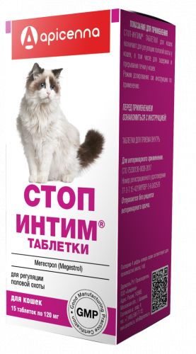 Стоп-Интим таблетки для кошек назначают для контрацепции и регуляции полового возбуждения кошкам, в том числе для задержки и прерывания течки у самок (кошек)