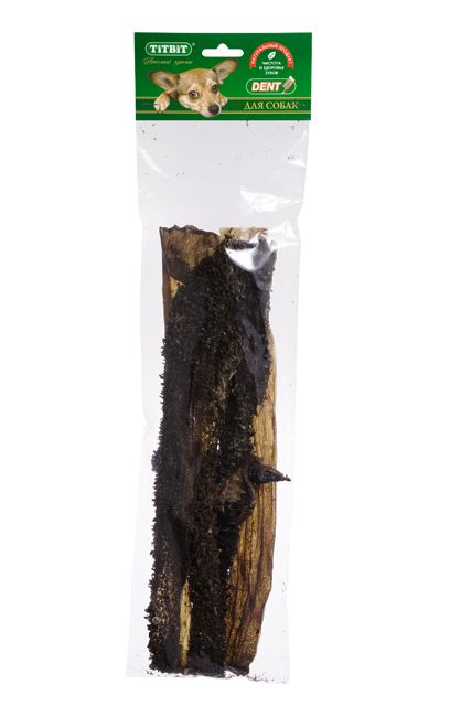 Высушенные пластины говяжьего рубца.Упаковка содержит 4-5 пластин длиной 35-40 см. Рубец говяжий представляет собой часть желудка КРС, точнее - первый из его преджелудков, в котором содержится полезная микрофлора. Ворсинки неочищенного сушёного рубца сохраняют на себе ферменты и витамины группы «В», вырабатываемые его микрофлорой при жизни животного. Содержат низкокалорийный, легкоусвояемый белок. Благодаря особой технологии сушки сохраняется до 60% процентов полезных веществ.