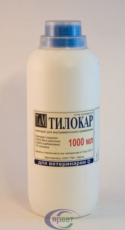 1.1. "Тилокар" (Tylocar) – комплексный препарат, в 1 мл которого содержится 10 мг тилозина, 0,05 мг карбахолина и 0,4 мг бета-каротина (провитамина А).