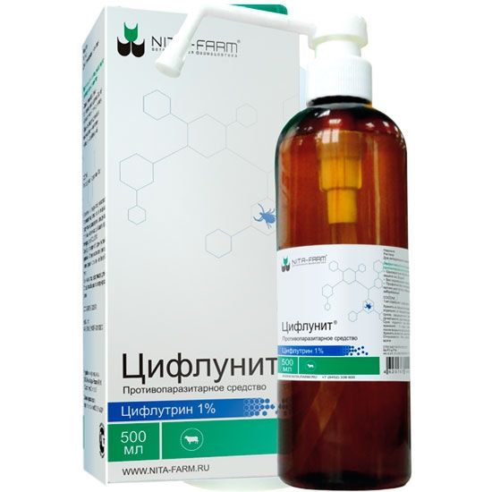 Инсектицидный, репеллентный препарат в виде раствора для наружного применения, обладает пролонгированным действием для защиты КРС от всех летающих насекомых. Раствор наносится в ограниченных количествах на спину животного, что обеспечивает стабильное инсектицидное действие на протяжении 4-6 недель. По внешнему виду препарат представляет собой маслянистую прозрачную жидкость желтого цвета. Цифлунит выпускаетсят в полимерных флаконах, закрытых навинчиваемыми крышками. С упаковкой прилагаются дозатор и гигиенические перчатки.
