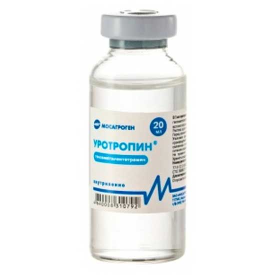 УРОТРОПИН — 40% раствор гексаметилентетрамина (уротропина). Препарат представляет собой прозрачную бесцветную жидкость. Препарат выпускают в форме раствора для инъекций, расфасованного по 20 мл в стеклянные флаконы соответствующей вместимости. Упаковка и маркировка производятся в соответствии с требованиями технических условий. Допускается другая фасовка, согласованная в установленном порядке.
