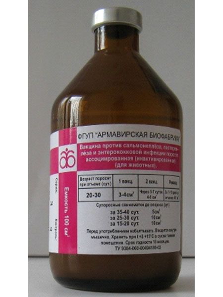 Дозы и способ применения: Вакцину вводят животным внутримышечно с внутренней стороны бедра. Поросят вакцинируют в возрасте от 20 до 30 дней, а свиноматок за 15-40 дней до опороса. Поросят вакцинируют двукратно, с интервалом между прививками в 5-7 дней, в дозе 3-4 см3 для первой и 4-5 см3 для второй прививки. За 7-10 дней до отъема поросят ревакцинируют однократно в дозе 4-5 см3. В хозяйствах особо неблагополучных по сальмонеллезу, пастереллезу или энтерококковой инфекции, где поросята заболевают в первые дни жизни, рекомендуется трехкратная вакцинация супоросных свиноматок, которую проводят по следующей схеме: