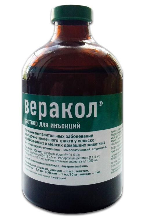 6. Веракол раствор для инъекций вводят подкожно или внутримышечно. В острых случаях — 1 – 3 раза в день до стабилизации состояния. Продолжительность лечения 7 – 10 дней. При необходимости курс повторяют. Разовая доза препарата на одно животное составляет: