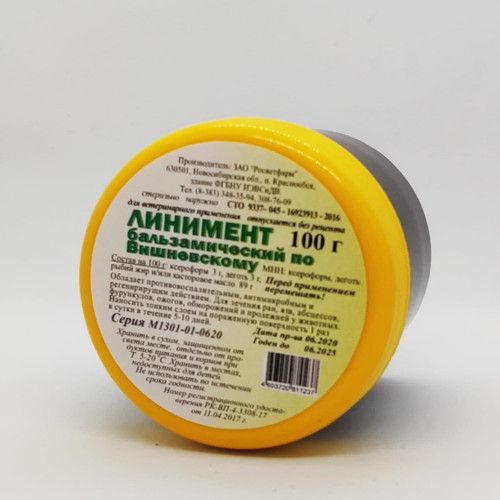 Линимент бальзамический по Вишневскому представляет собой линимент от светло-желтого до серовато-коричневого цвета со специфическим запахом. Срок годности Линимента бальзамического по Вишневскому при соблюдении условий хранения – 5 лет со дня изготовления. Запрещается использовать препарат после окончания срока годности.