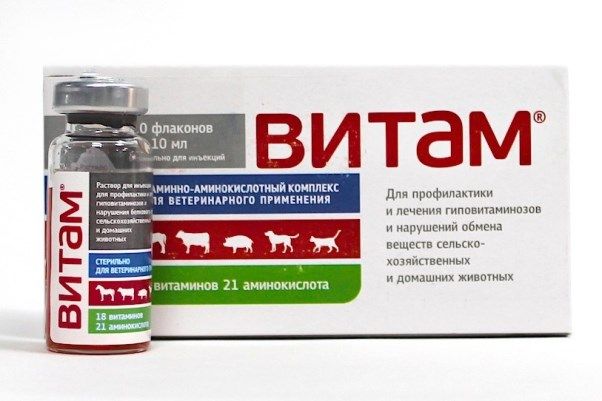 ПОКАЗАНИЯ К ПРИМЕНЕНИЮ: для профилактики заболеваний за счёт нормализации обмена веществ и повышения устойчивости к стрессам в качестве витаминного и общеукрепляющего средства у молодняка, при анемиях, гипоавитаминозах, токсикозах беременности у взрослых животных. Для ускорения выздоровления и повышения естественного иммунитета при лечении инфекционных и вирусных заболеваний (чума плотоядных, энтериты, гепатит, пневмонии, бронхиты и пр.), сопровождающихся интоксикацией, обезвоживанием, истощением (белковой недостаточностью), хирургических операциях. При отравлении синтетическими и пищевыми ядами. Витам хорошо сочетается с антибиотиками, сульфаниламидами, вакцинами. Возможно применение его в качестве растворителя для этих средств. Витаминизация стельных коров и супоросных свиноматок для получения жизнеспособного и здорового приплода, уменьшения риска послеродовых заболеваний за 1 месяц и за 2 недели до родов. Новорожденным телятам и поросятам применяют Витам (для более технологичного применения возможно введение вместе с железосодержащими препаратами) для повышения естественной резистентности, увелечения имунного ответа на вакцины. Изготовлено в России.